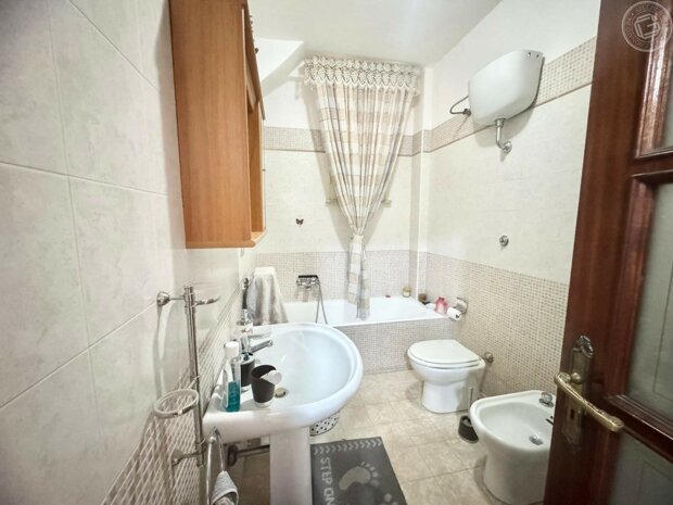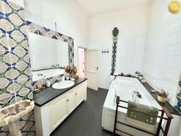 L'immobile si compone di 17 ampi e confortevoli vani, comprensivi di una spaziosa cucina e quattro bagni così distribuiti: il primo dotato di vasca idromassaggio e sanitari standard, il secondo con box doccia, sanitari standard e termoarredo e, due ulteriori servizi con wc.
